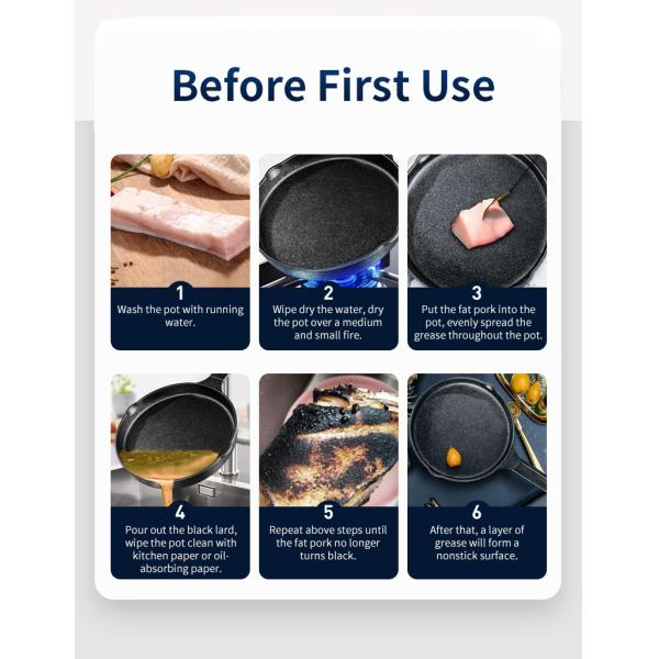●1. First time using: Wash the pot with boiling water for the first use. Put raw fat pork into a pot, low fire, and use a clamp or spatula to move the pork to make it move in acircular motion from the inside to the outside in the pot and spread evenly3-5 minutes.